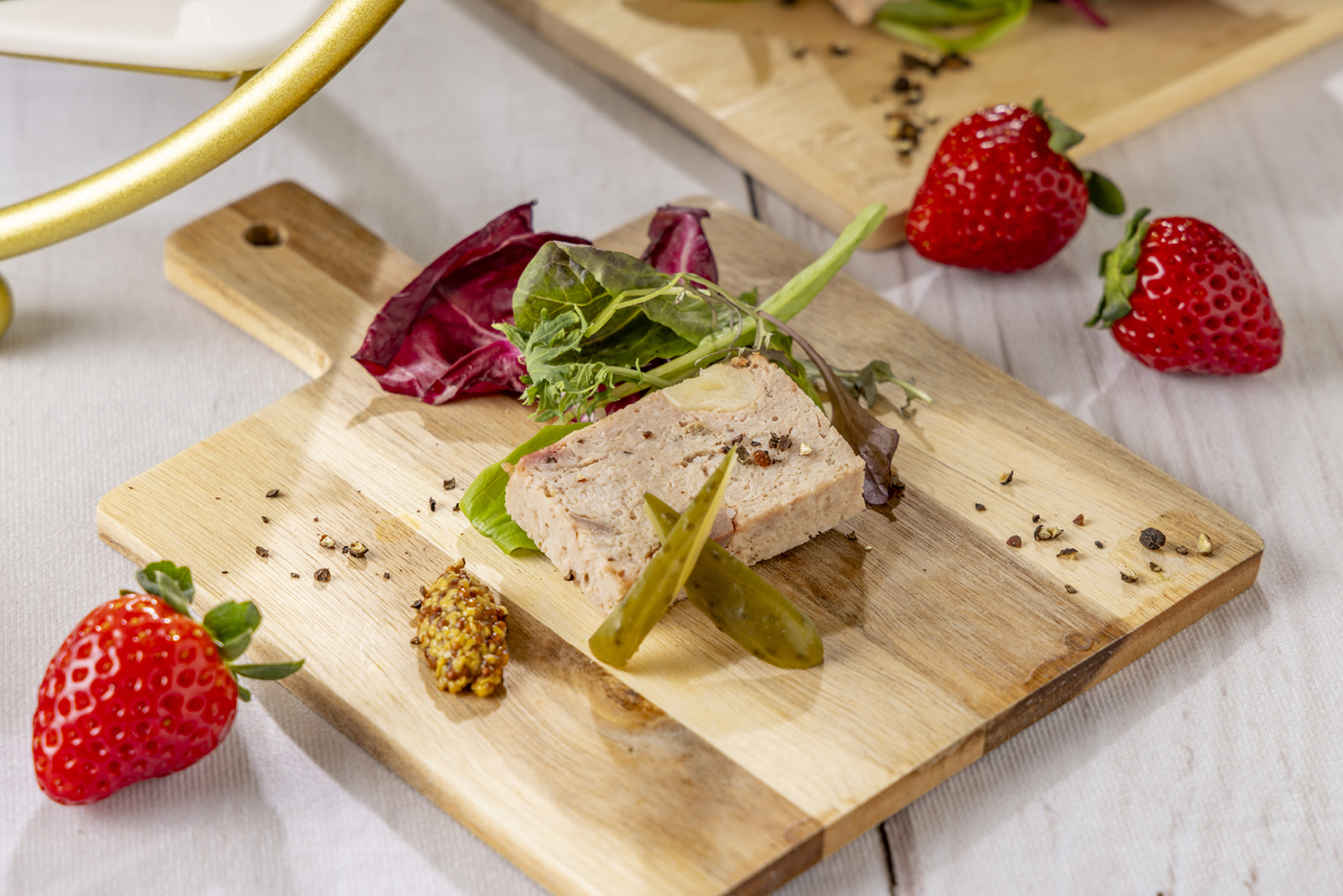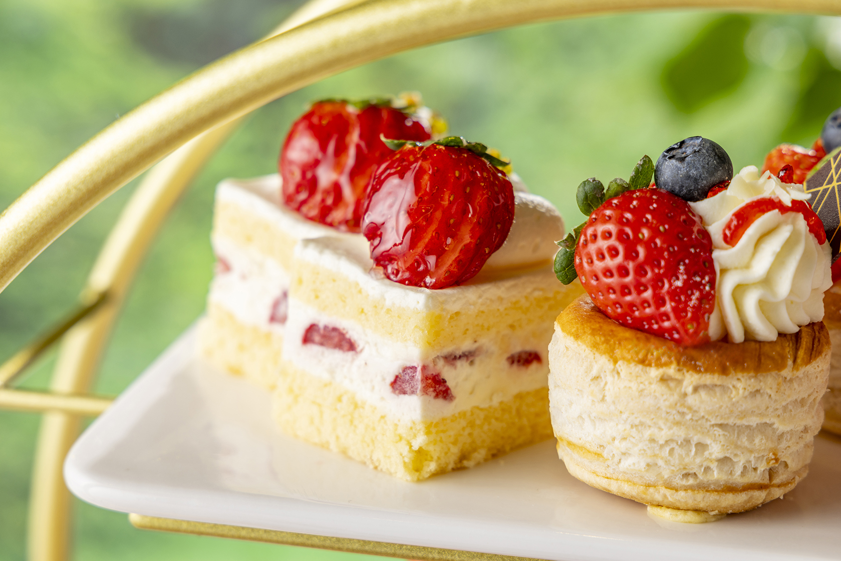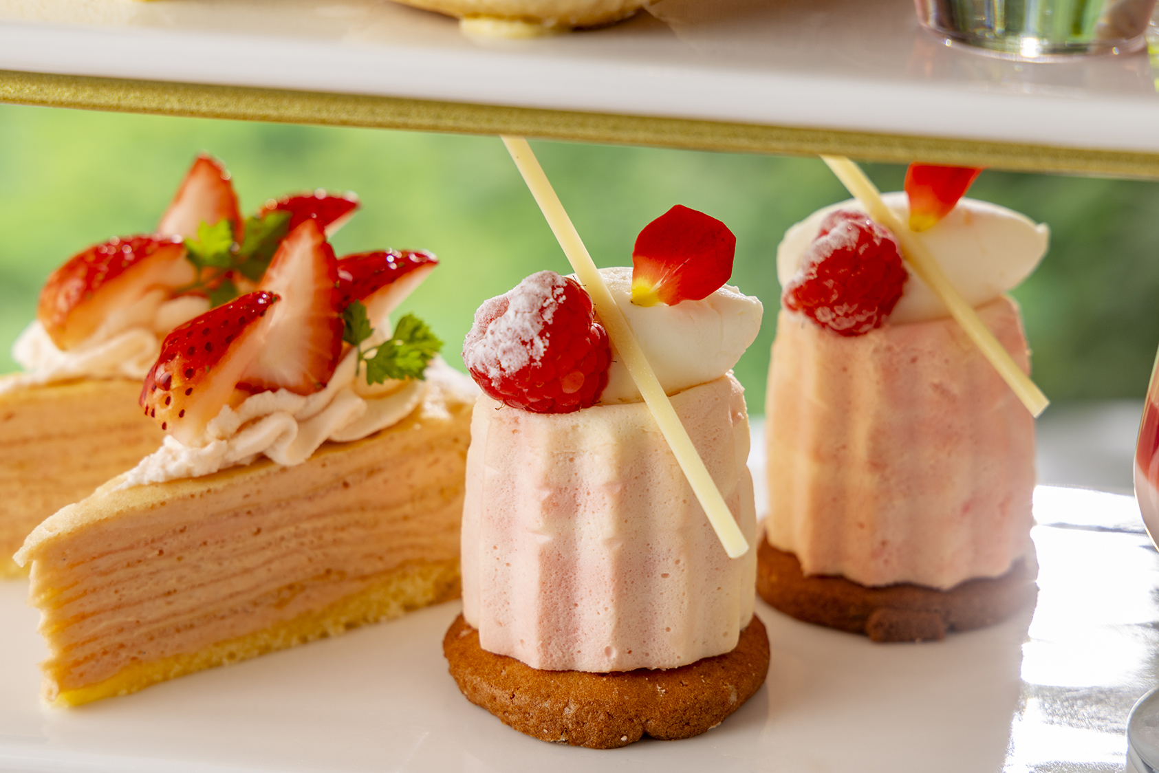 ゴールドスタンドに並ぶ赤とピンクのスイーツは、窓外の緑や自然光に映える華やかな佇まい。